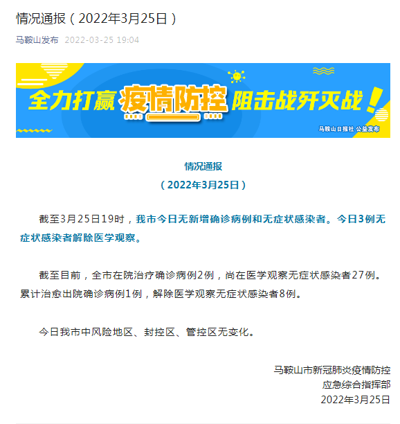 新安晚报 安徽网 大皖新闻讯 3月25日,马鞍山市新冠肺炎疫情防控应急综合指挥部发布情况通报。 截至3月25日19时,马鞍山市今日无新增确诊病例和无症状感染者。今日3例无症状感染者解除医学观察。 截至目前,全市在院治疗确诊病例2例,尚在医学观察无症状感染者27例。累计治愈出院确诊病例1例,解除医学观察无症状感染者8例。 今日我市中风险地区、封控区、管控区无变化。 特别声明:以上文章内容仅代表作者本人观点,不代表新浪网观点或立场。如有关于作品内容、版权或其它问题请于作品发表后的30日内与新浪网联系。
