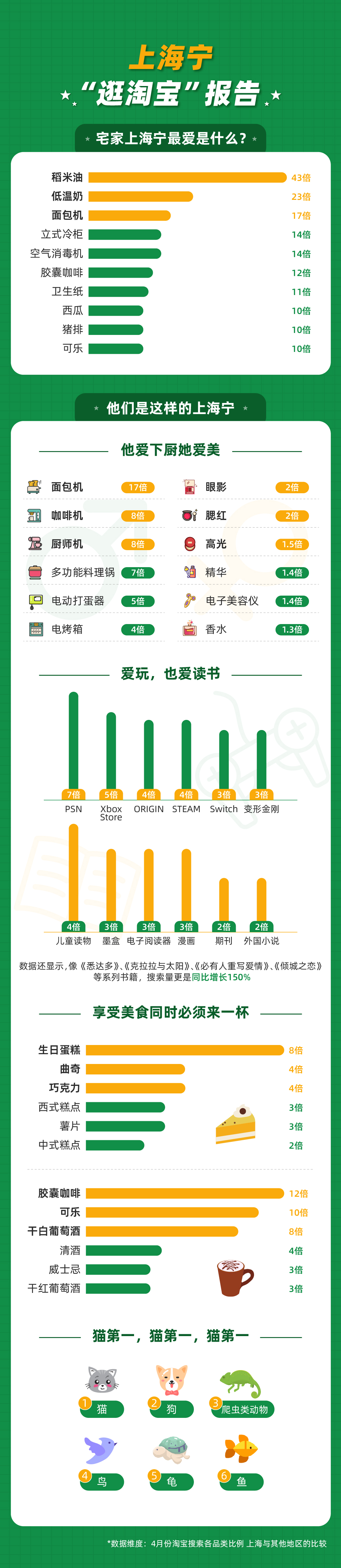 过去的一个月,每天有600万上海人保持着“逛淘宝”的习惯。从淘宝的搜索数据里,我们看到了这样的一群上海人:爱看书、爱美食但希望尽量让机器来帮忙,生活必须保持仪式感。 爱看书的上海人:既爱与孩子一起阅读又爱独自阅读。 上海人如何打发在家的24小时?淘宝给出了部分答案。在过去的一个月,上海用户在淘宝的搜索类目中,书籍的占比是其它城市的3倍以上。其中,“儿童读物”是他们搜索最多的一类书籍,看来每晚除了准时看刘畊宏外,“亲子阅读”也不可少。此外,像《悉达多》、《克拉拉与太阳》、《必有人重写爱情》等名著,搜索量更是同比增长150%,展现了上海人不一样的心愿书单。 上海人朋友圈的心愿书单咖啡香里伴书香,而上海人对咖啡的渴望已经溢出屏幕。上海地区用户搜索饮料的前10大类目中,咖啡独占6项。胶囊咖啡、咖啡液、咖啡豆占据前三,相应搜索量的占比是其它城市的6-12倍。而上海人最爱的可口可乐排名第二,成为仅次于“胶囊咖啡”的第二大硬通货。 上海用户下单书和咖啡液对美食对生活:上海人的倔强,也是仪式感。 淘宝搜索显示,西式蝴蝶酥成为上海人的淘宝“搜索爆款”,白葡萄酒和威士忌也冲上热榜。牛排配红葡萄酒、海鲜配白葡萄酒、午餐来一杯Sangraia。这是上海人的倔强,也是上海人的仪式感。 让人倍感温馨的是,生日蛋糕的搜索占比是其他城市的8倍之多。在不出门的日子里,上海人依旧努力维持生活的精致与体面。 而对习惯了快节奏生活的上海白领来说,这恐怕是他们与厨房最亲密的一段时间。有人欣然成为料理大师,有人忍不住偷偷在淘宝上疯狂搜索厨房小家电。 淘宝搜索显示,过去一个月上海用户对“面包机"的搜索占比,与其它城市相比竟高达17倍。和面机、多功能料理锅、果蔬消毒清洗机、电动打蛋器等懒人电器,搜索占比均为其它城市的4倍以上。看来上海人严格贯彻着尽可能一切交给机器的“懒人哲学”。 为自己找点乐子,上海人可是这方面的“头号玩家”。 此前就有报告指出,在全国爱宠人士中,上海人最舍得给“主子”花钱。从淘宝搜索中还可以看出,猫、狗之外,上海人最爱的宠物还有龟、鳖、鸟等。 不受物流影响、无需发货的虚拟服务,成为一大热门商品。一款“一元大象”的商品在平台销量迅速走高,上海区域销量上涨最为明显,同比超过700%。此外,野生奥特曼、野生蚊子等虚拟单品也颇有热度,卖家用“脑电波发货”,买家则用“意念收货”。 图说:淘宝上“一元大象”等虚拟商品热度攀升 这600万每天在逛淘宝的上海人告诉我们,生活的仪式感来自于对自我的坚守,无论在什么情况下,都要保持认真生活的姿态。 上海人“逛淘宝”报告