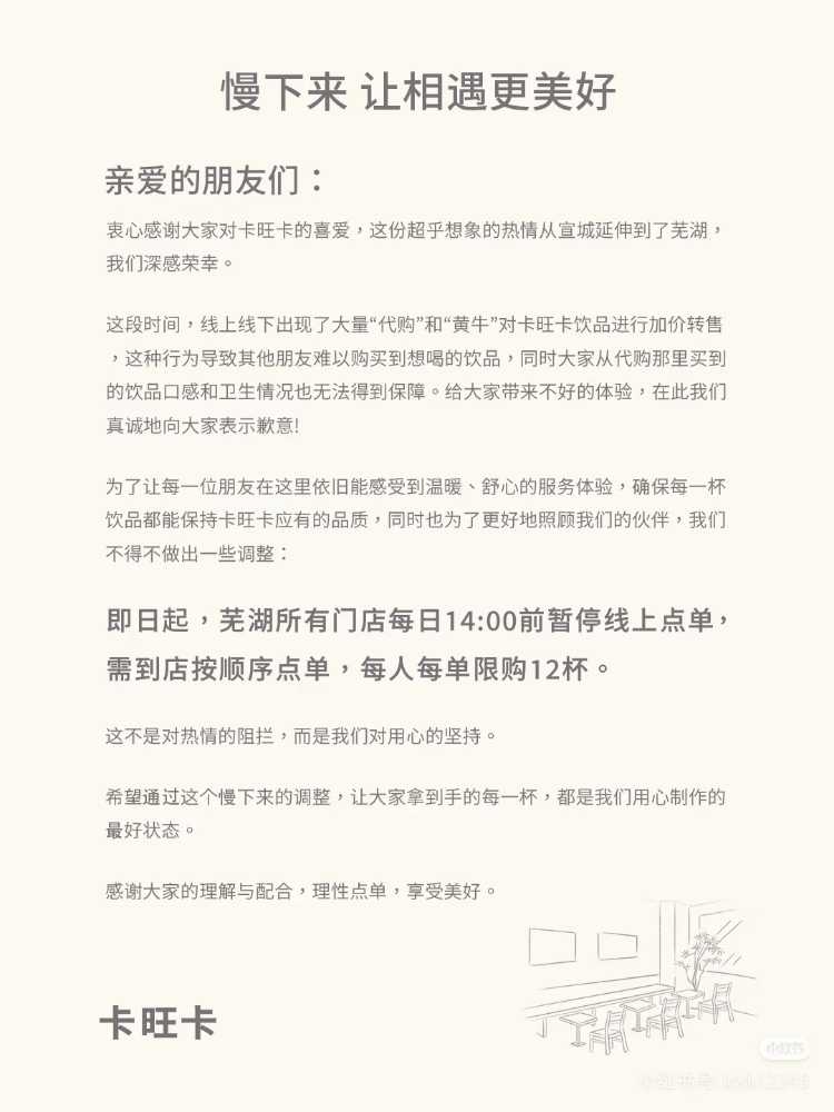 广德卡旺卡的火爆带动了宣城市门店的消费热情,最近几天芜湖各大门店销售同样水涨船高。 12月3日下午,合新闻记者从卡旺卡方面获悉:即日起,芜湖所有门店每日14:00前暂停线上点单。