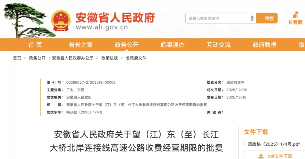 省交通运输厅、省发展改革委、省财政厅: 《关于确定望(江)东(至)长江大桥北岸连接线收费经营期限的请示》(皖交路〔2025〕190号)悉。经研究,现批复如下: 一、原则同意望(江)东(至)长江大桥北岸连接线高速公路收费经营期限30年,即从2015年12月30日至2045年12月29日止。 二、收费标准、免费范围等由省交通运输厅 ...