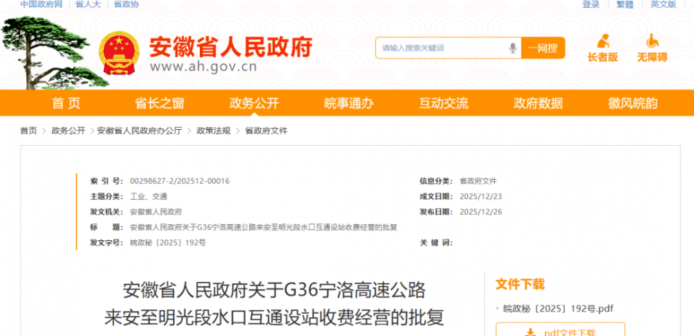 省交通运输厅、省发展改革委、省财政厅: 《关于G36宁洛高速公路来安至明光段水口互通设站收费的请示》(皖交路〔2025〕213号)悉。经研究,现批复如下: 一、同意G36宁洛高速公路来安至明光段水口互通设站收费,站名为“水口收费站”(位于K54+054m处),由安徽滁宁高速公路股份有限公司收费。 二、水口收费站自开通之日起 ...