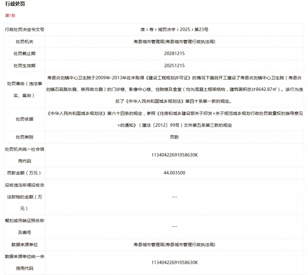 近日,据“信用淮南”公开披露行政处罚信息,因未取得《建设工程规划许可证》的情况下擅自开工建设,寿县炎刘镇中心卫生院被处以罚款44.003500万元。行政处罚决定书文号是淮﹝寿﹞城罚决字﹝2025﹞第23号。 公开处罚信息显示,处罚事由是寿县炎刘镇中心卫生院于2009年-2013年在未取得《建设工程规划许可证》的情况下擅自开 ...