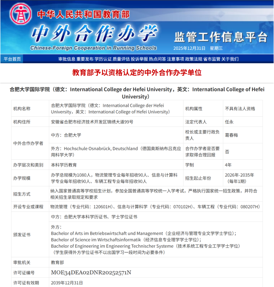 近日,教育部公布中外合作办学机构和项目审批结果,合肥大学与德国奥斯纳布吕克应用科学大学合作举办的合肥大学国际学院获批成立,标志着安徽省第二家中外合作办学机构正式落户合肥大学。 该学院首批开设车辆工程、信息与计算科学、物流管理三个本科专业,采用“4+0”培养模式,教学团队汇聚中德两国优质师资力量。学生修满 ...