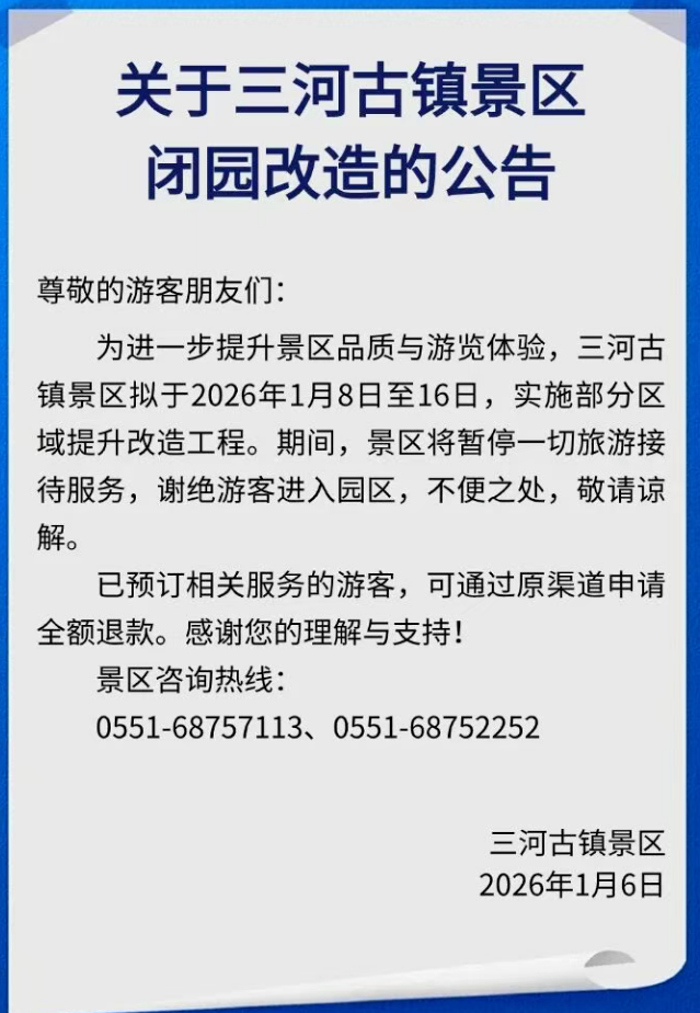 1月6日,记者从三河古镇景区了解到,为进一步提升景区品质与游览体验,三河古镇景区拟于2026年1月8日至16日,实施部分区域提升改造工程。期间,景区将暂停一切旅游接待服务,谢绝游客进入园区。