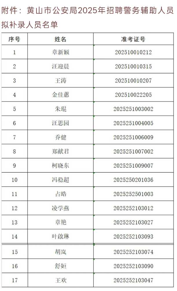 根据《安徽省公安机关警务辅助人员管理条例》《黄山市公安局2025年公开招聘留置看护警务辅助人员公告》《黄山市公安局2025年公开招聘警务辅助人员公告》的有关规定,经报名、资格审查、体能测评、笔试、面试、体检、考察等程序,根据缺额情况按成绩从高到低顺序进行补录,确定章新颖等17名同志为黄山市公安局拟补录警务辅助 ...