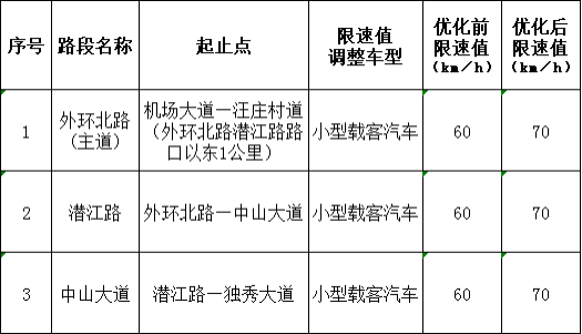 关于调整部分道路小型载客汽车限速值的通告 为进一步提升道路通行能力,更好地服务经济社会发展,根据《中华人民共和国道路交通安全法》及其实施条例等相关法律法规规定,经交通工程论证后,决定自2026年1月19日起,对外环北路、潜江路、中山大道等3条道路部分路段的小型载客汽车限速值进行调整(其他车型限速值不调整),相 ...