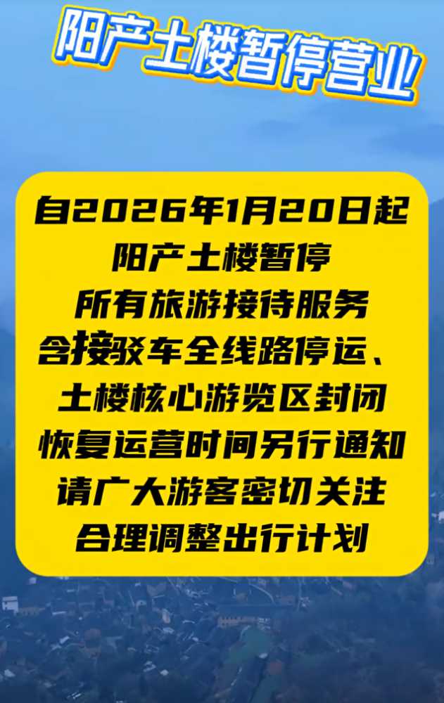 自2026年1月20日起,阳产土楼暂停所有旅游接待服务,含接驳车全线路停运,土楼核心游览区封闭,恢复运营时间另行通知,请广大游客密切关注,合理调整出行计划!