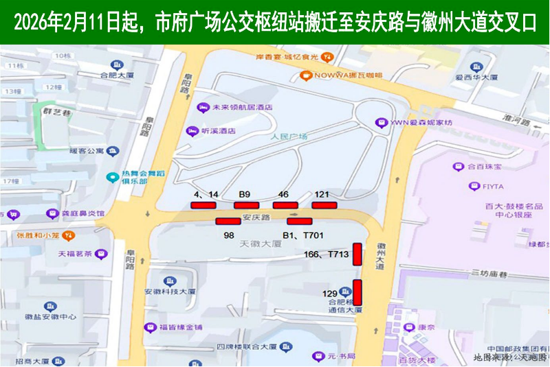 记者从合肥公交集团了解到,市府广场枢纽站将整体搬迁至安庆路与徽州大道交叉口。2月11日起,合肥公交集团公司调整4路、14路、46路、98路、117路、121路、129路、166路、B1路、B9路、T701路、T713路等12条公交线路走向及停靠站。据悉,市府广场公交枢纽站于2008年启用,至今已有18年时间。 ...