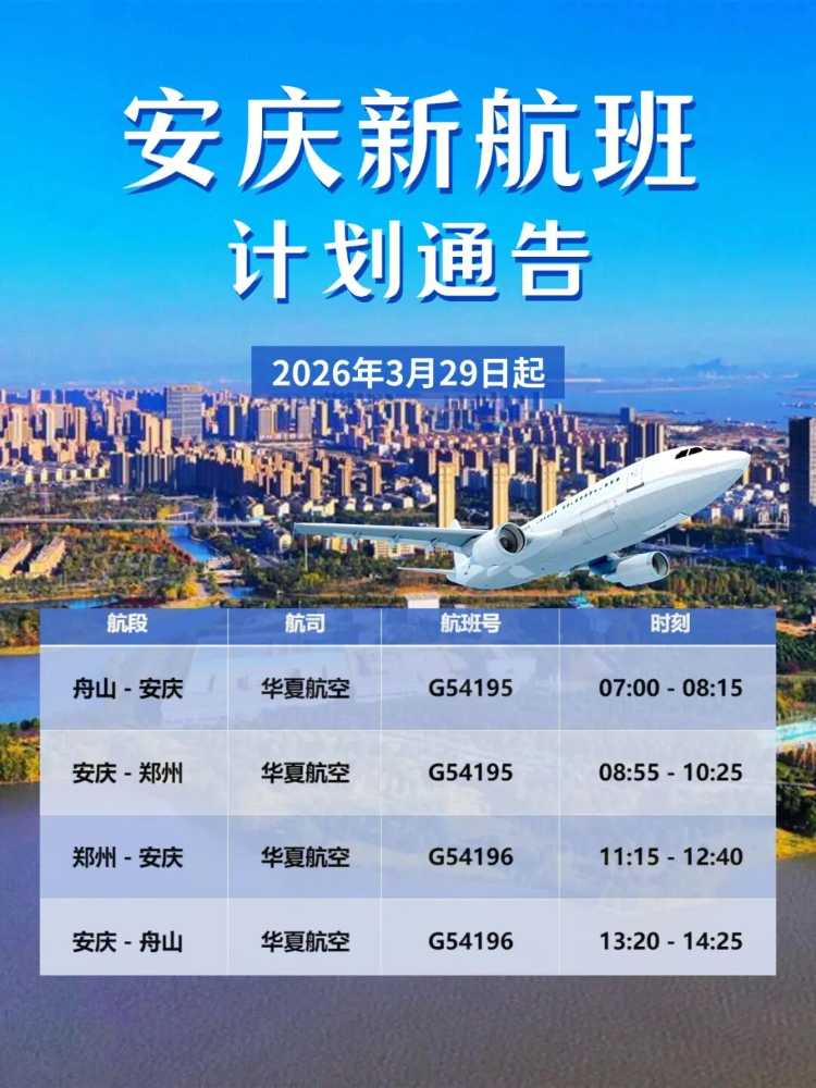 据安庆天柱山机场微信公众号最新消息:3月29日起,安庆机场将开通由华夏航空执飞的“舟山=安庆=郑州”航线。 该航线班期为每周一、三、五、七共4班,机型C909。 计划时刻为:舟山07:00-08:15安庆,安庆08:55-10:25郑州,郑州11:15-12:40安庆,安庆13:20-14:25舟山。 开通初期推出机票优惠政策,单段机票最低2.5折起!有出行 ...