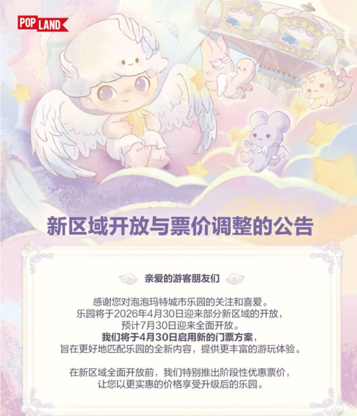3月30日,泡泡玛特城市乐园小程序发布调价公告称,将于2026年4月30日迎来部分新区域的开放,预计7月30日将实现全面开放,拟于4月30日启用新的门票方案。 公告显示,4月30日到7月29日,泡泡玛特城市乐园的标准乐园每位平日价格为148元,高峰日为178元;标准乐园游+嘉年华3次票的平日价格198元,高峰日为228元。 在7月30日泡 ...