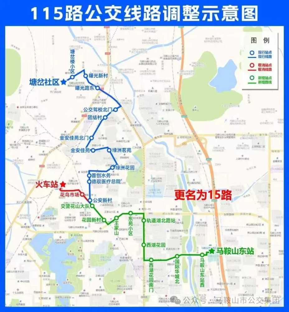 马鞍山市民注意!为进一步方便塘岔、绿洲名苑等社区与城铁、高铁的衔接市公交集团将于4月15日起对公交115路进行优化调整。 具体如下: 01、线路编号 115路更名为15路 02、起终点站 由“新塘小区—火车站”调整为“塘岔社区—马鞍山东站” 03、线路走向 局部由湖东路、花山路、红旗路优化调整为湖东路、花山路、湖北路、江东 ...